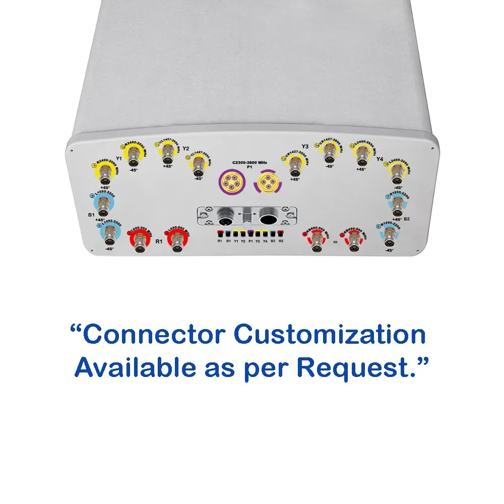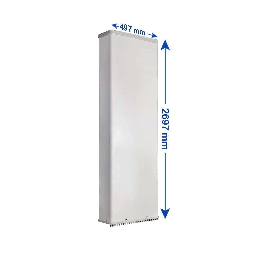 25-Port, TDD Hybrid Panel Antenna, 65° HBW, (2x) 690-960 / (2x) 1695-2200 / (2x) 1427-2690 / (2x) 2490-2690 / 2300-3800 MHz, 16.5/16.5/17/17/17.5/17.5/17.5/17.5/16 dBi, 2-12°T, 2.697 m