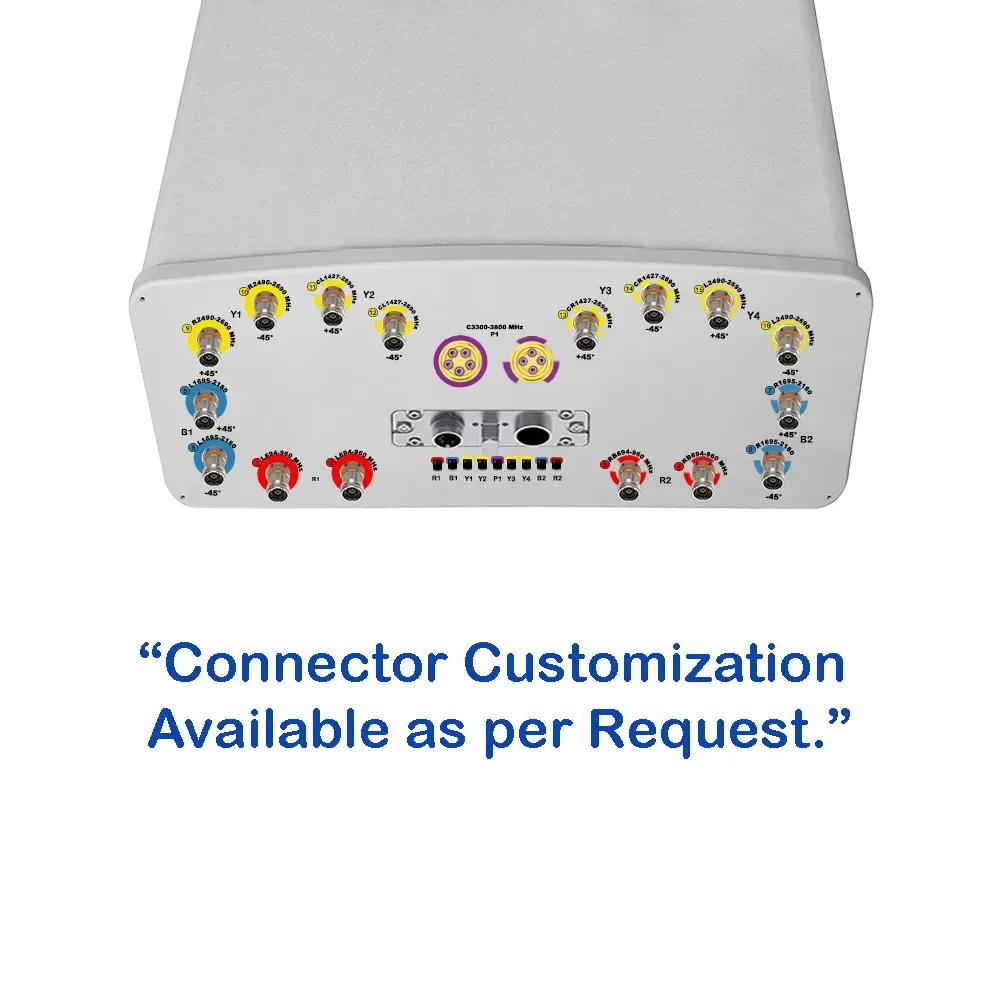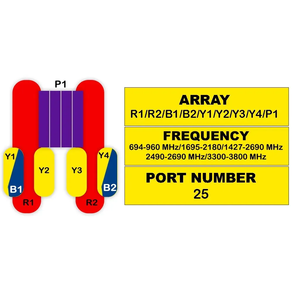 25-Port, TDD Hybrid Panel Antenna, 65° HBW, (2x) 694-960 / (2x) 1695-2180 / (2x) 1427-2690 / (2x) 2490-2690 / 3300-3800 MHz, 16/16/17/17/17/17/17/17/17 dBi, 2-12°T, 2.097 m
